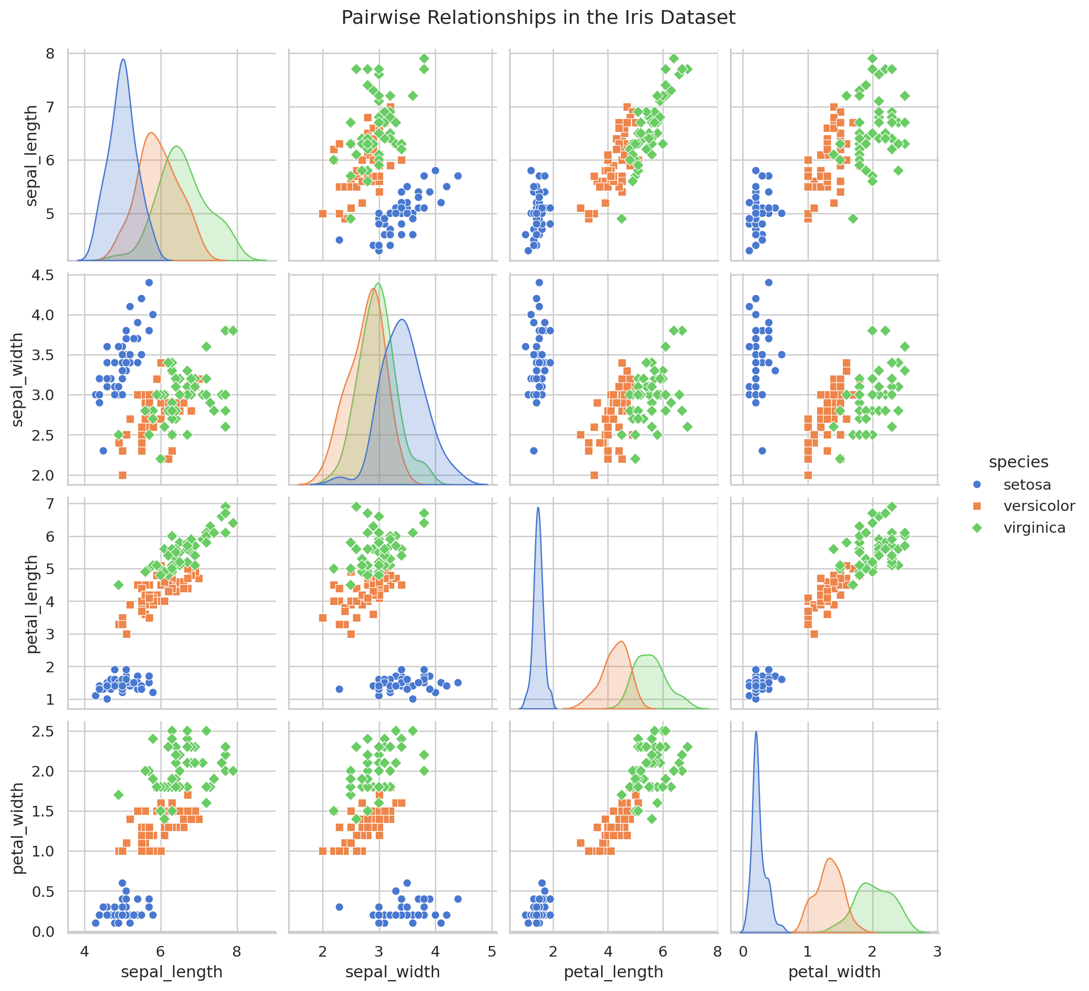 plt.suptitle('Pairwise Relationships in the Iris Dataset' , y= 1.02 ) # 添加总标题