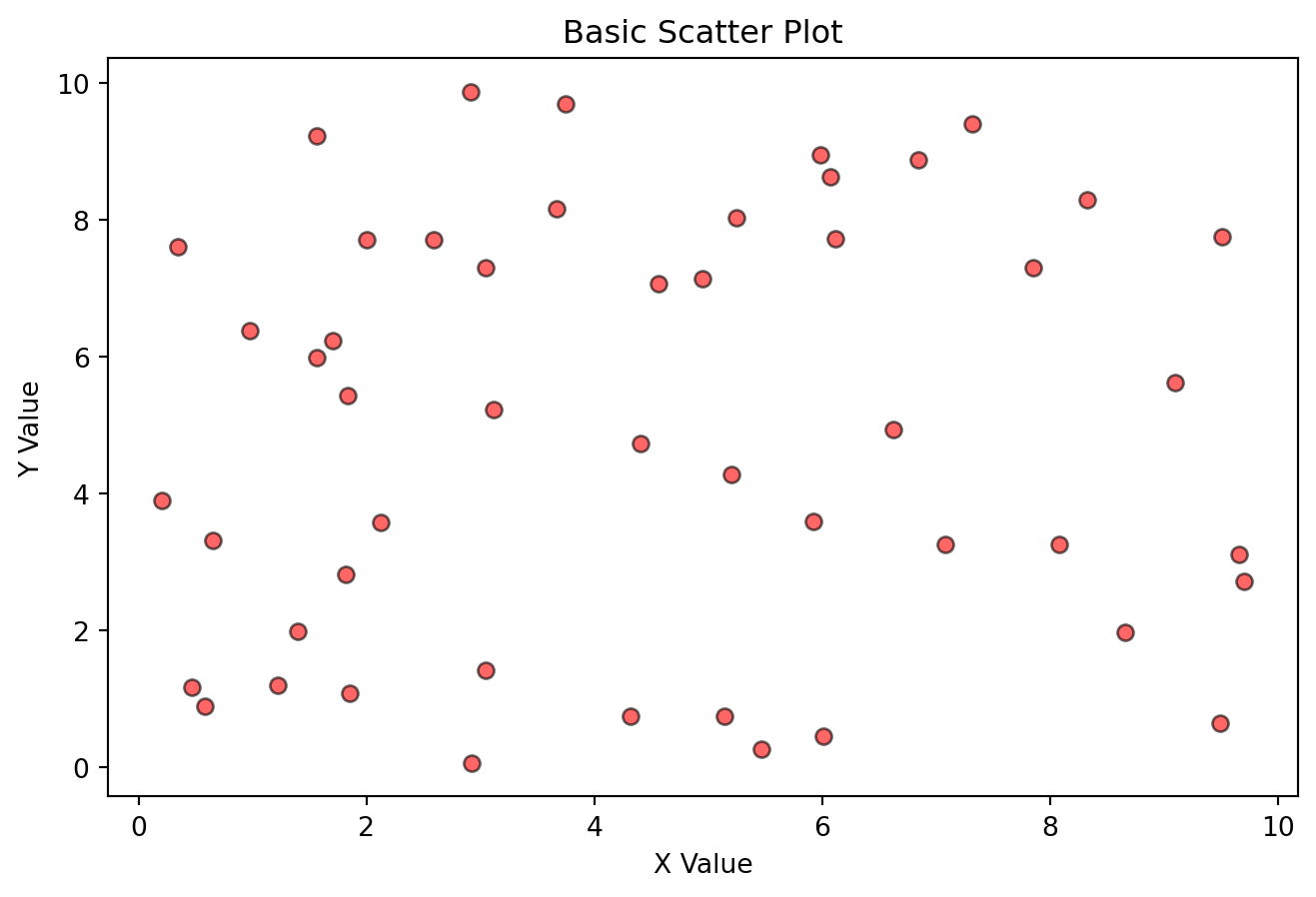 散点图是探索两个数值变量之间是否存在关联的利器。每个点代表一个数据样本,其在 x-y 平面上的位置由两个变量的值决定。