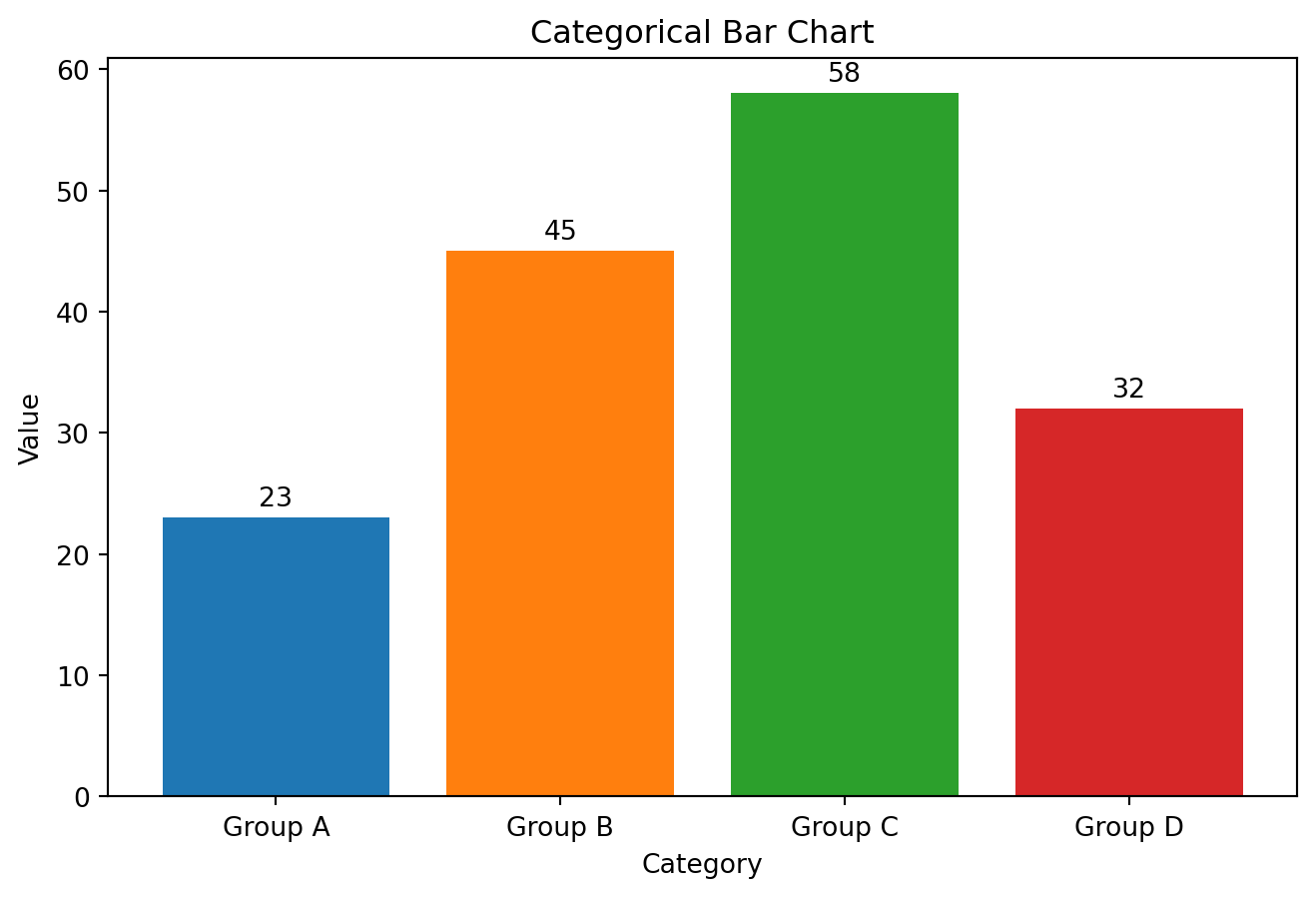 plt.bar(categories, values, color= ['#1f77b4' , '#ff7f0e' , '#2ca02c' , '#d62728' ]) # 为每个条形指定不同颜色