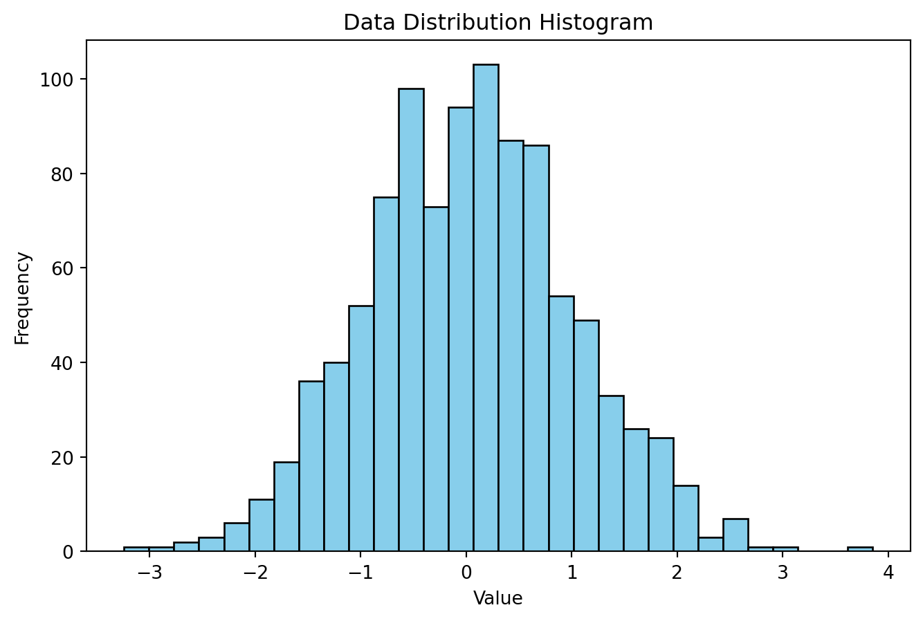 直方图是理解单个数值变量分布情况的核心工具。它将数值范围分割成若干个“箱子”(bins),然后统计落入每个箱子的数据点数量。