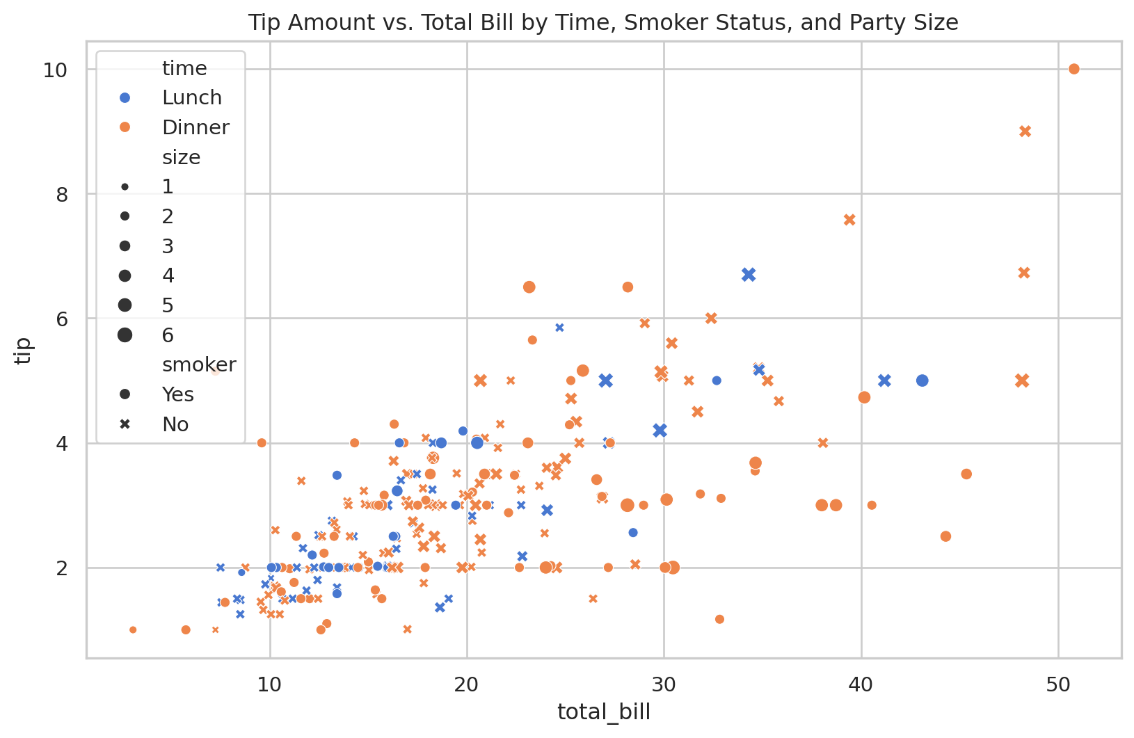 scatterplot 是 Seaborn 的明星函数之一。除了基本的 x-y 关系,它还能通过 hue, style, size 等参数,将多达五个维度的信息压缩到一张二维图表中,极大地提升了信息密度。