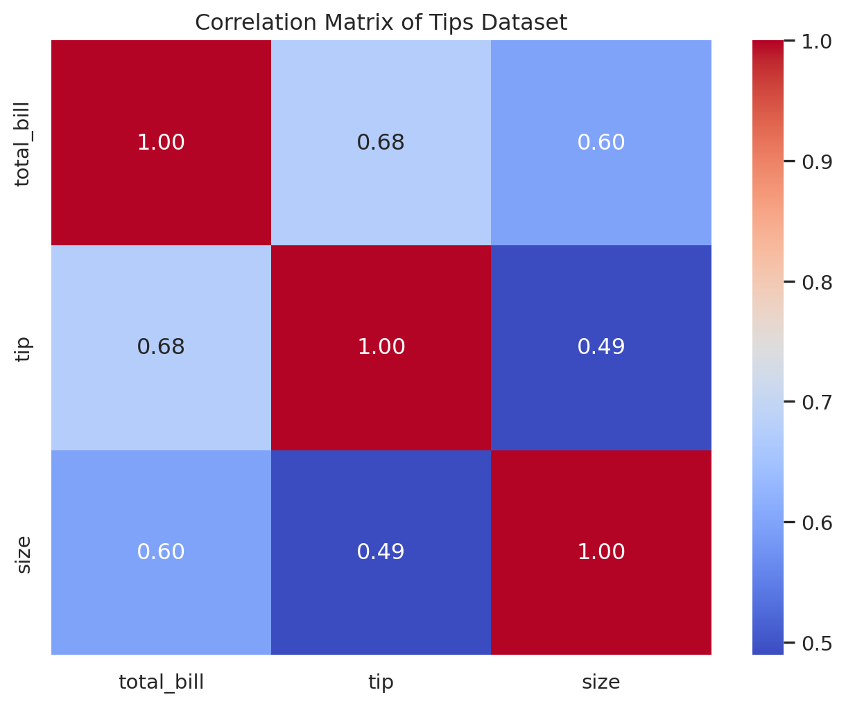 我们将使用 Seaborn 内置的 tips (餐厅小费) 数据集来展示其强大功能。这个数据集记录了顾客的账单总额、支付的小费、性别、是否吸烟等信息。